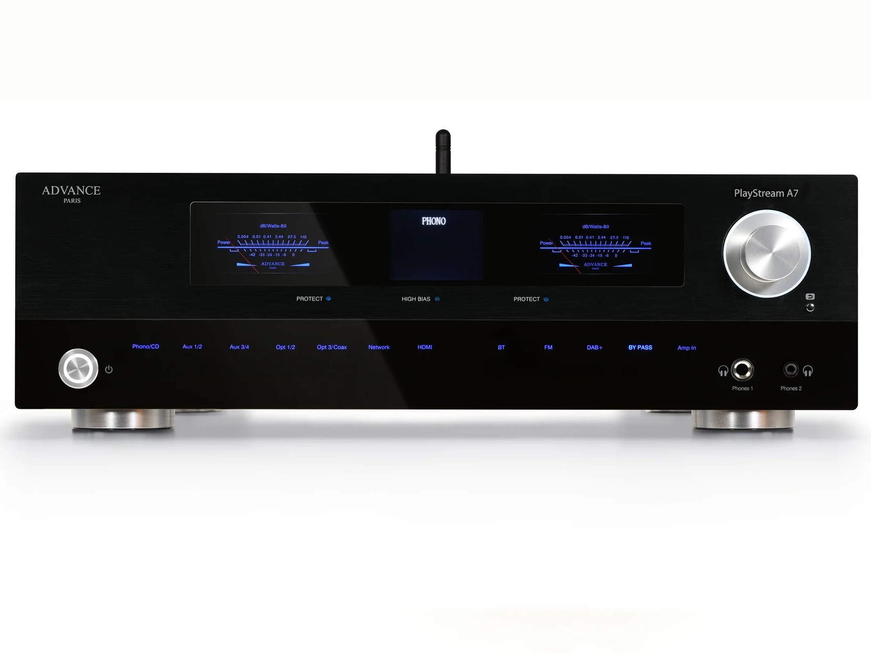 Ο Advance Paris PlayStream A7 ειναι δικαναλος ραδιοενισχυτης 2x 115 watts. Διαθετει FM, DAB, WiFi, Network Player (Spotify, Deezer, Qobuz, Tidal, TuneIn, iHeartRadio, vTuner, Napster), HDMI ARC, USB DAC (εισοδοι 1x coaxial, 3x optical, 1x Ethernet), εισοδο για δεκτη Bluetooth (extra). Διαθετει phono MM/MC, εξοδους Pre Out και Sub Out.