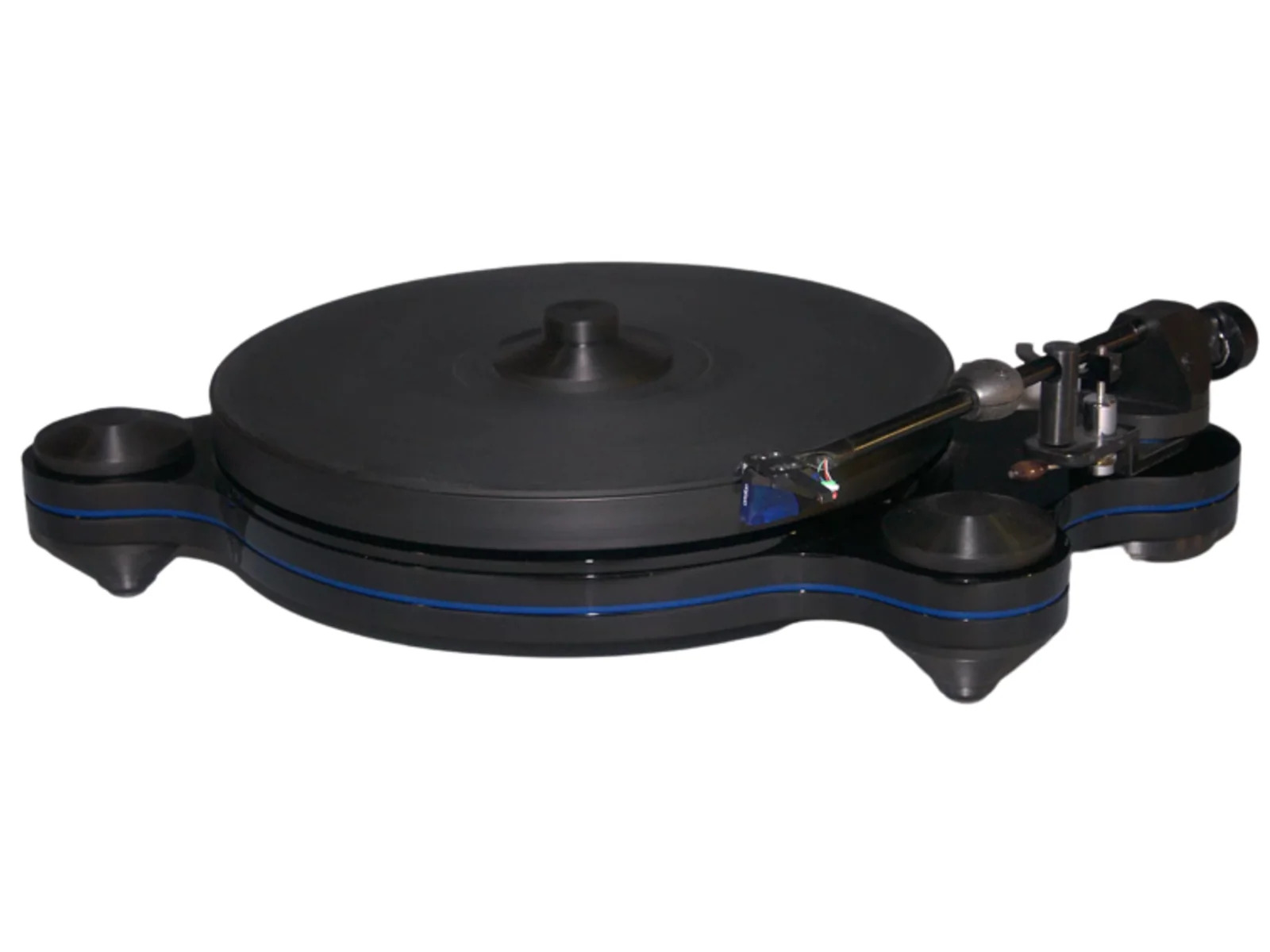 The turntable comes equipped with the new Origine tonearm and with or without a supplied Ortofon MC-1 Turbo; a high-output moving coil phono cartridge. This unipivot tonearm is cleverly designed with its pivot contact point set on the same plane as the record contact point with the stylus and with the tracking force counterweight for added stability while tracking the grooves. The compliance of a phono cartridge, or the “springiness” of the cantilever/motor suspension assembly, plays an important role with unipivot tonearms. We address this issue by using a movable arm tube weight that we nicknamed “the olive” which allows to vary the tonearm’s effective mass. This adjustability enables to make a better match of compliance and effective mass, thus allowing the use of a very wide range of phono cartridges with the Origine. The Origine tonearm has internal wiring from Cardas Audio!