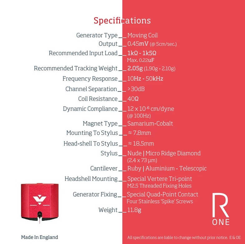 Η Vertere Ruby One ειναι κεφαλη ΜC με nude micro ridge diamond βελονα και cantilever ρουμπινι-αλουμινο. Frequency response 10Hz-50.000Hz. Βαρος 11,2 gr, εξοδος 0.45mV.