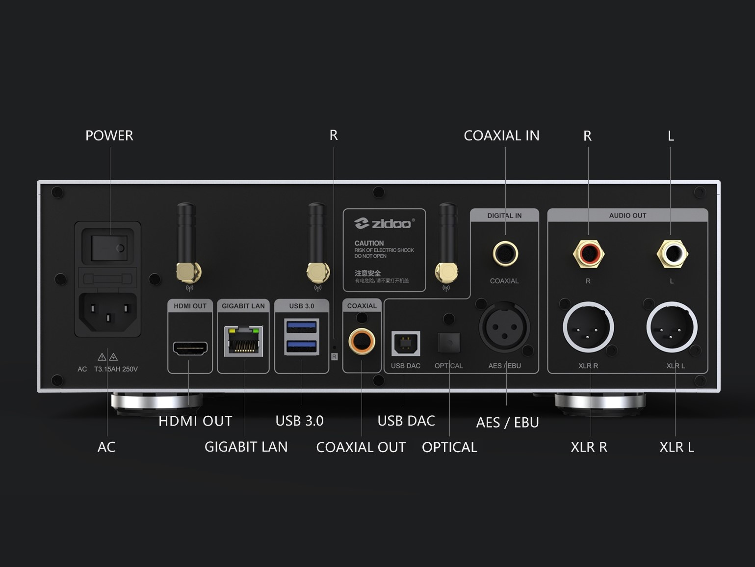 Το Zidoo NEO S είναι 4K UHD media/network player/streamer και DAC με 5" OLED HD οθόνη αφής και media chipset Realtek RTD1619DR (ARM Cortex-A55 hexacore) σε συνδυασμό με GPU ARM Mali-G51 MP3. Διαθέτει εσωτερικό SSD 256 GB (M.2 SATA 3.0, επεκτάσιμο έως 1 TB), 2x ESS9068 DAC για ήχο μέχρι DSD512 και PCM 768 kHz/32-bit.Είσοδοι: 1x USB DAC input, 1x Coaxial, 1x Optical, 1x AES/EBU, 1x Ethernet, Wi-Fi (dual band 2.4GHz & 5GHz) και Bluetooth audio. Έξοδοι: 1x HDMI, 1x XLR balanced line out, 1x RCA line out, 1x Coaxial, 1x Optical, 1x AES/EBU, 1x USB Audio, 1x ακουστικών 4.4mm balanced και 1x ακουστικών 6.35mm single-ended.